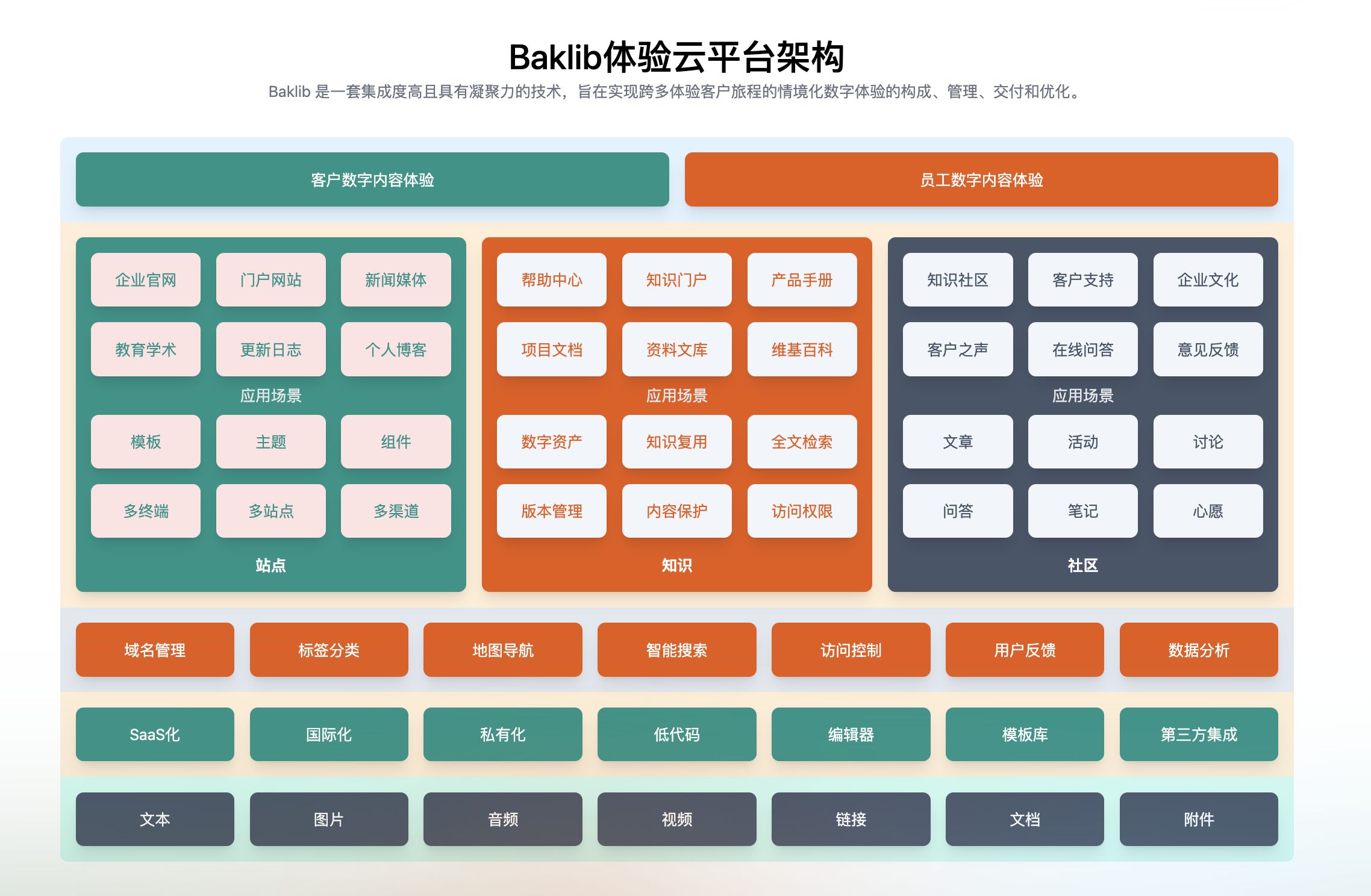 作为全球领先的“AI + 内容”平台,Baklib通过“知识管理+数字互动+可组合体验”的创新架构,赋能企业构建高效、智能、可持续演进的知识服务体系。核心优势包括:
