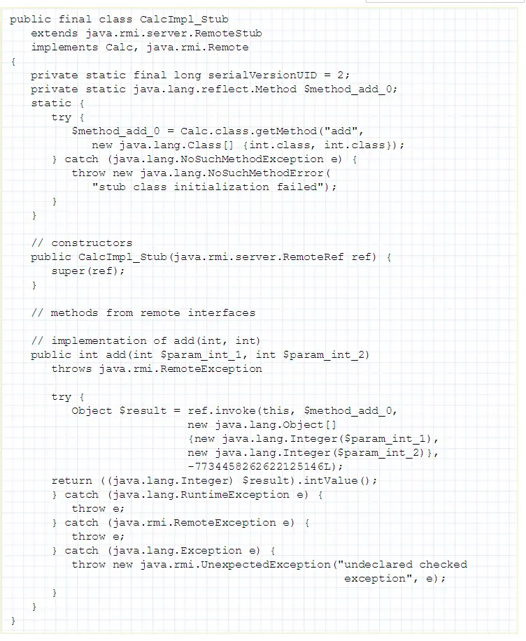 现在看一个这个生成的stub源代码,注意到他的构造参数需要个RemoteRef类型的对象,这个对象从哪里获取呢?继续下面看。