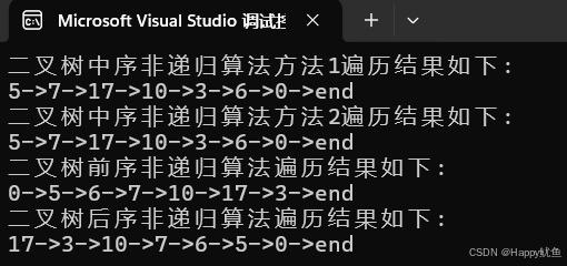 printf("二叉树后序非递归算法遍历结果如下:\n");