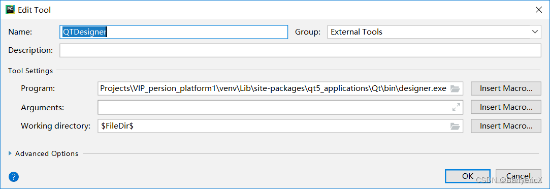 Arguments:加入以下语句“-m PyQt5.uic.pyuic $FileName$ -o $FileNameWithoutExtension$.py”