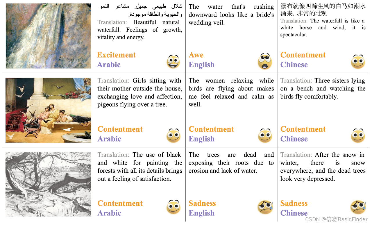 ArtELingo(艺术语灵)是一个基准数据集,旨在促进跨语言和跨文化多样性的研究。相较于之前的ArtEmis项目(一个包含来自WikiArt的80K幅艺术作品的集合,带有0.45M个情感标签和英文描述),ArtELingo在此基础上新增了0.79M个阿拉伯语和中文标注,以及4.8K个西班牙语标注,用于评估“文化转移”性能。超过51K幅艺术作品在三种语言中拥有五条以上不同的标注,这种的多样性标签使得研究人员能够研究跨语言和文化之间的相似性和差异性。