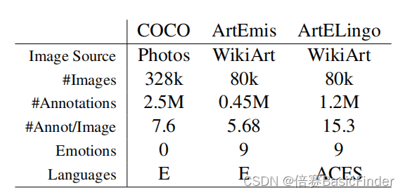三个数据集的比较: ArtELingo 拥有来自 ACES 的1.2M条标注* 阿拉伯语 (A)、中文 (C)、英语 (E) 和西班牙语 (S)。