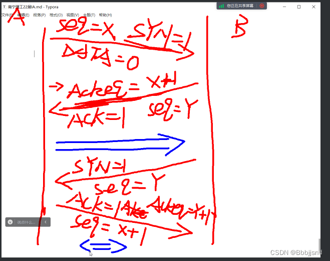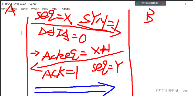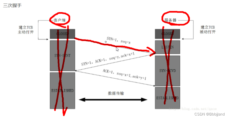 第一个报文的序列号随机产生,DATA=0,SYN=1(告诉服务端请求建立连接)