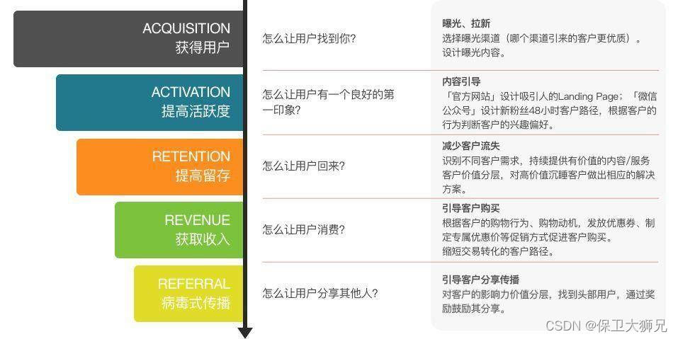 一种以用户为中心的着眼于转化率的漏斗型的数据收集测量模型,从获取(Acquisition)、激活(Activition)、留存(Retention)、收益(Revenue)和推荐(Referral)5个环节增长。