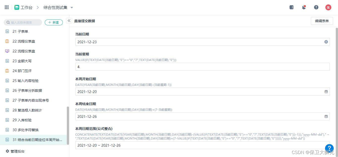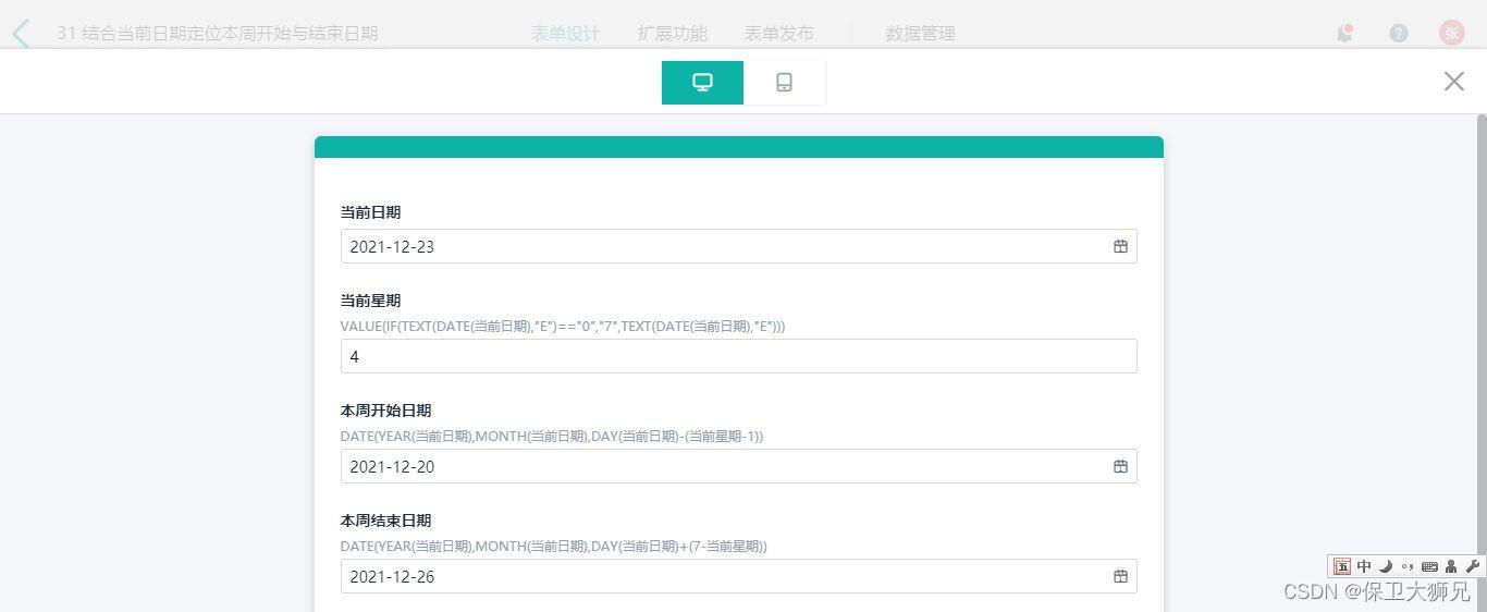 “日期范围”根据填写日期算填写日期所属周的第一天(星期一)的日期及最后一天(星期日)的日期,填写日期已默认为当时,“日期范围”字段怎么写公式 ?