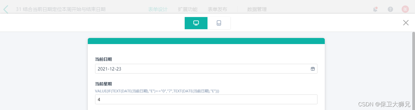 - IF(TEXT(DATE(当前日期),"E")=="0","7",TEXT(DATE(当前日期),"E"))