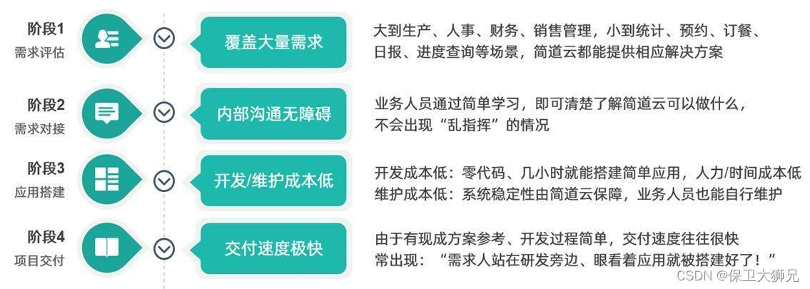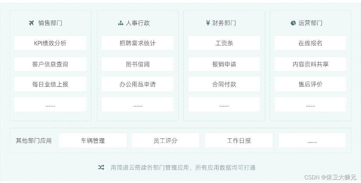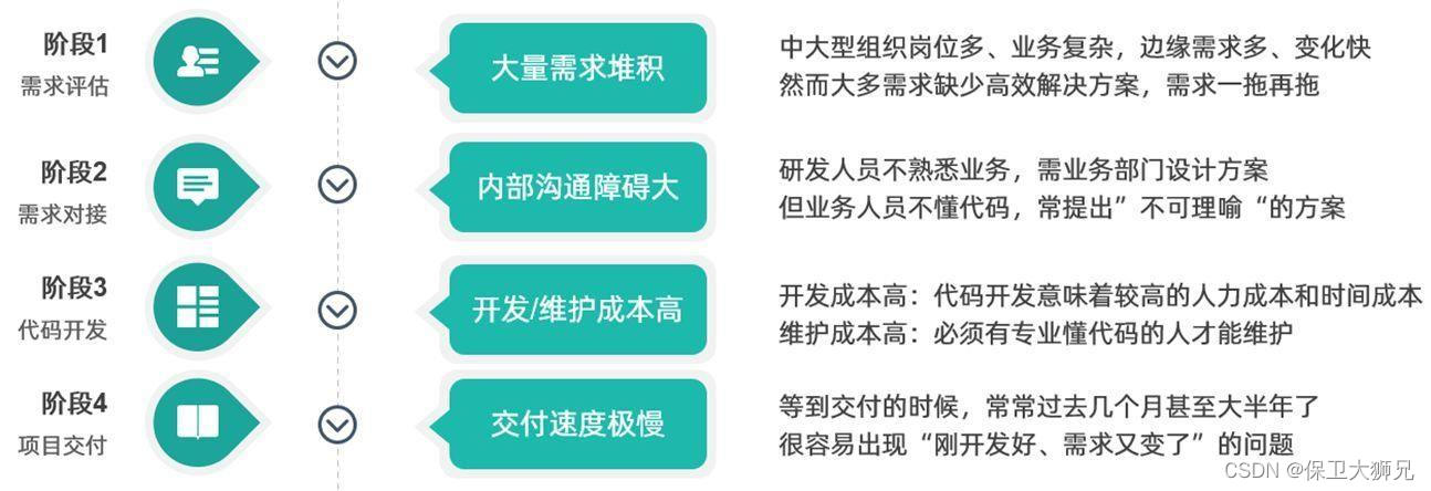 很多零代码平台的定位也十分清楚:零代码开发平台的出现,不是为了革命程序员,而是为了高效解决传统信息化速度的滞后问题。