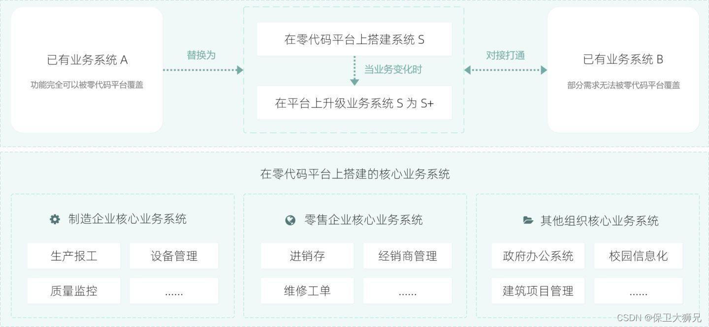 通过零代码平台,可以搭建出新的管理系统(后续业务发生变化时,直接在线升级迭代即可)。但同时,如果企业已经有的业务系统,可以考虑直接用零代码平台取代,也可以直接打通老业务系统和零代码系统之间的数据。