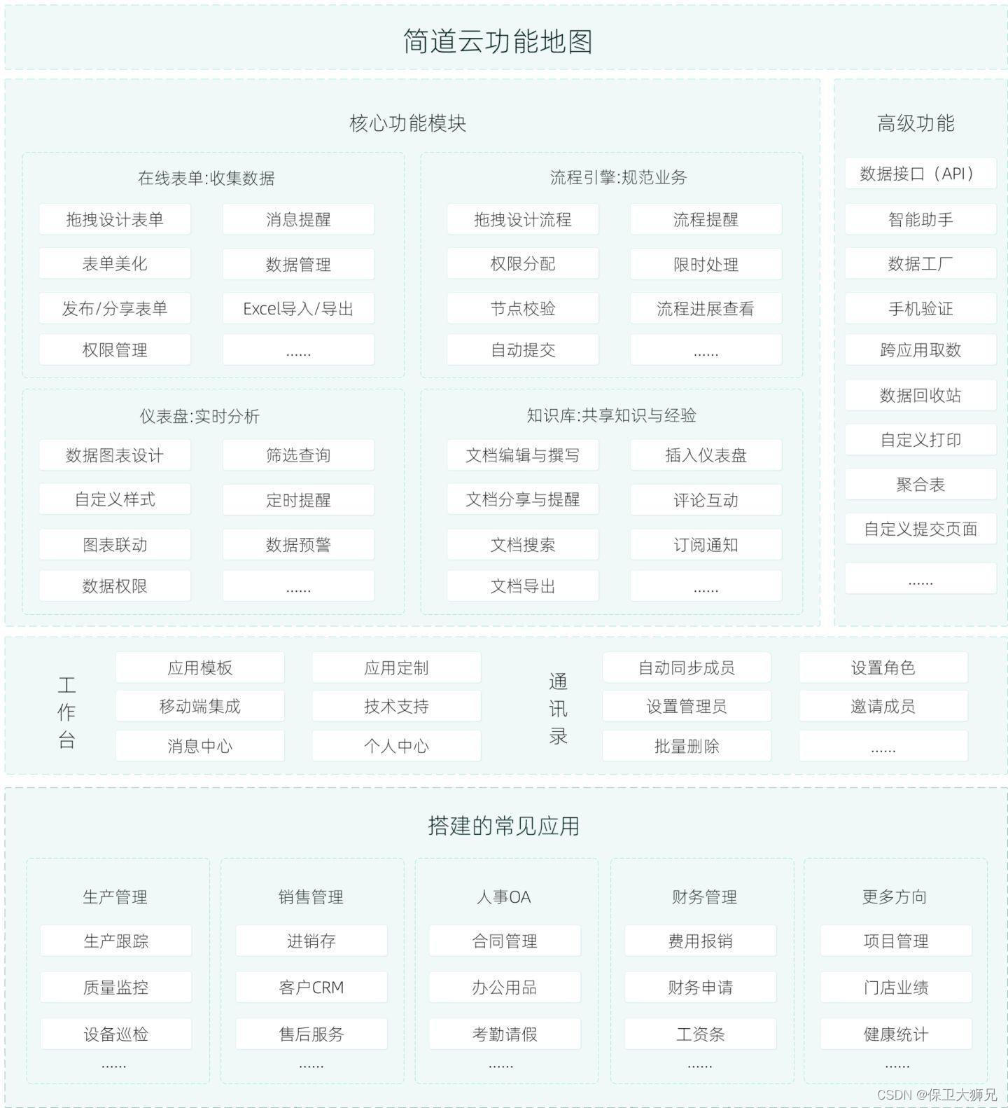 以简道云为例,我们可以看一款零代码平台会提供哪些具体的功能: