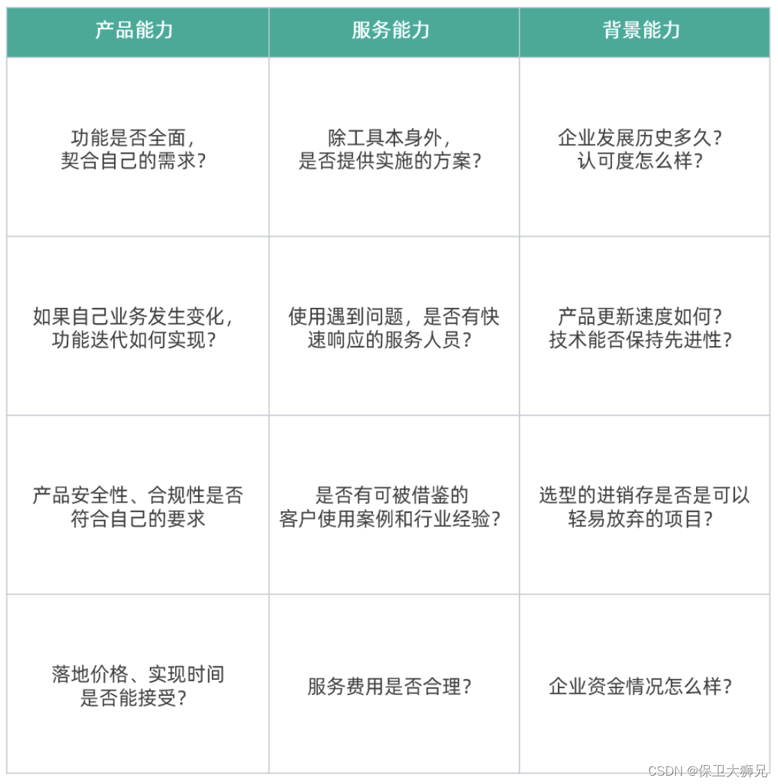 当然如果有其他的想法,也可以参照列出的选型要点12问进行筛选。