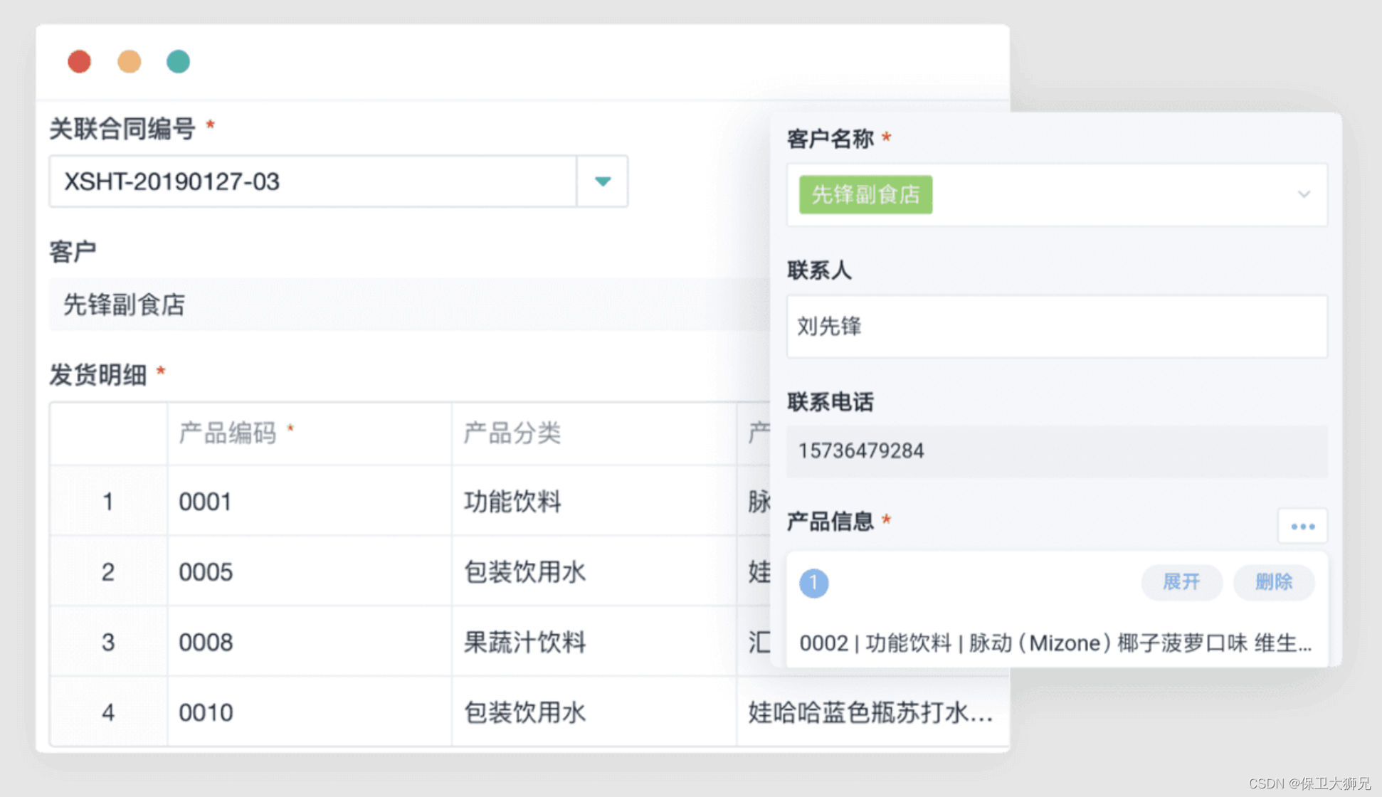 业务员根据合同编号调取客户信息,系统可实现智能发货退货。