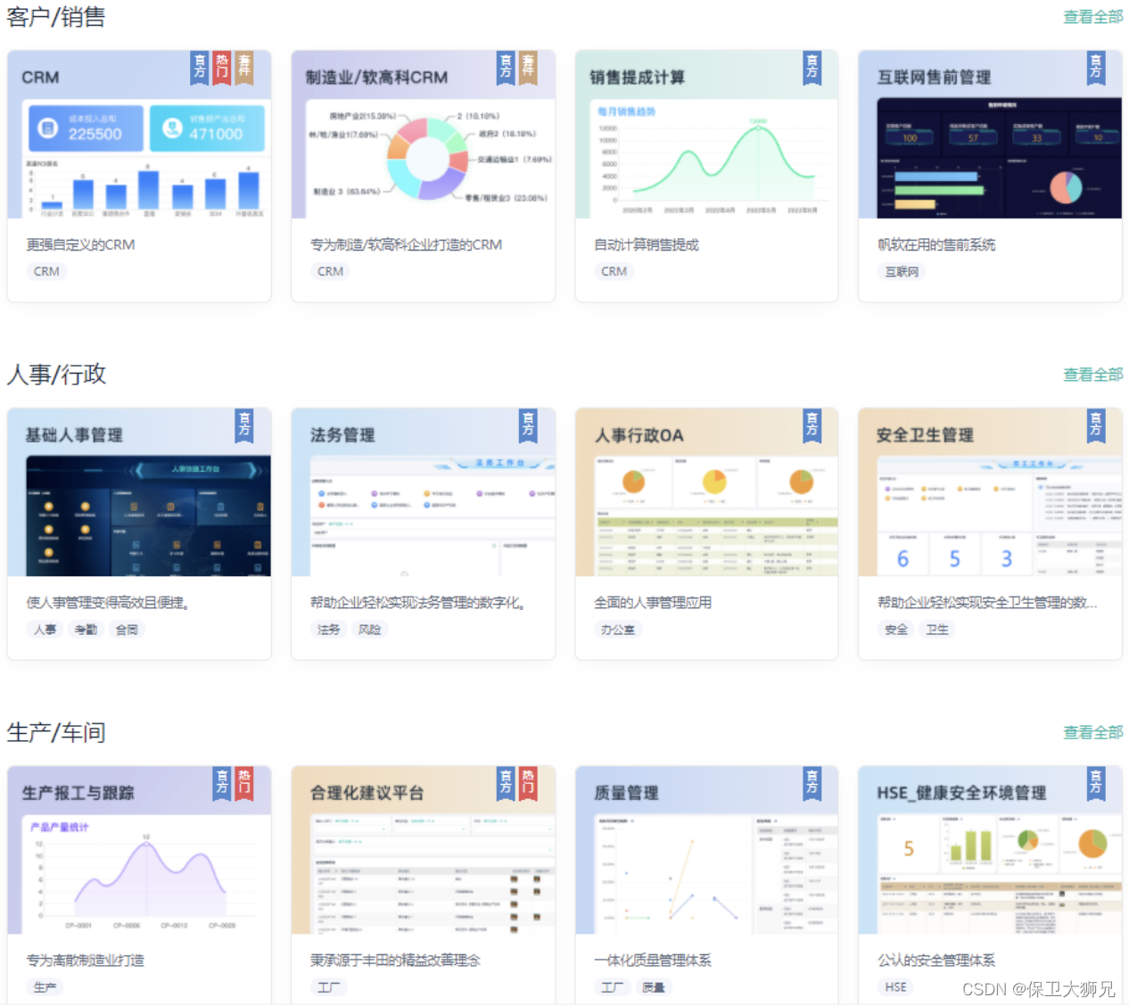 使用模板可以很好的解决这个问题,低代码平台设计出来的模板,可以解决比如CRM、ERP等某场景可能产生的大部分需求,如果企业有其他的需求,也完全可以在模板的基础上进行自定义修改,当然也可以参考模板全部重新设计。