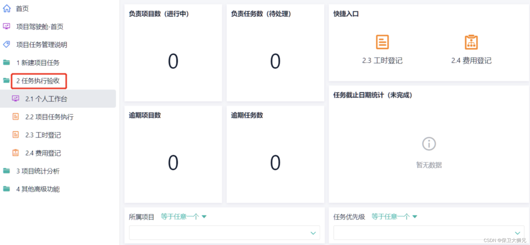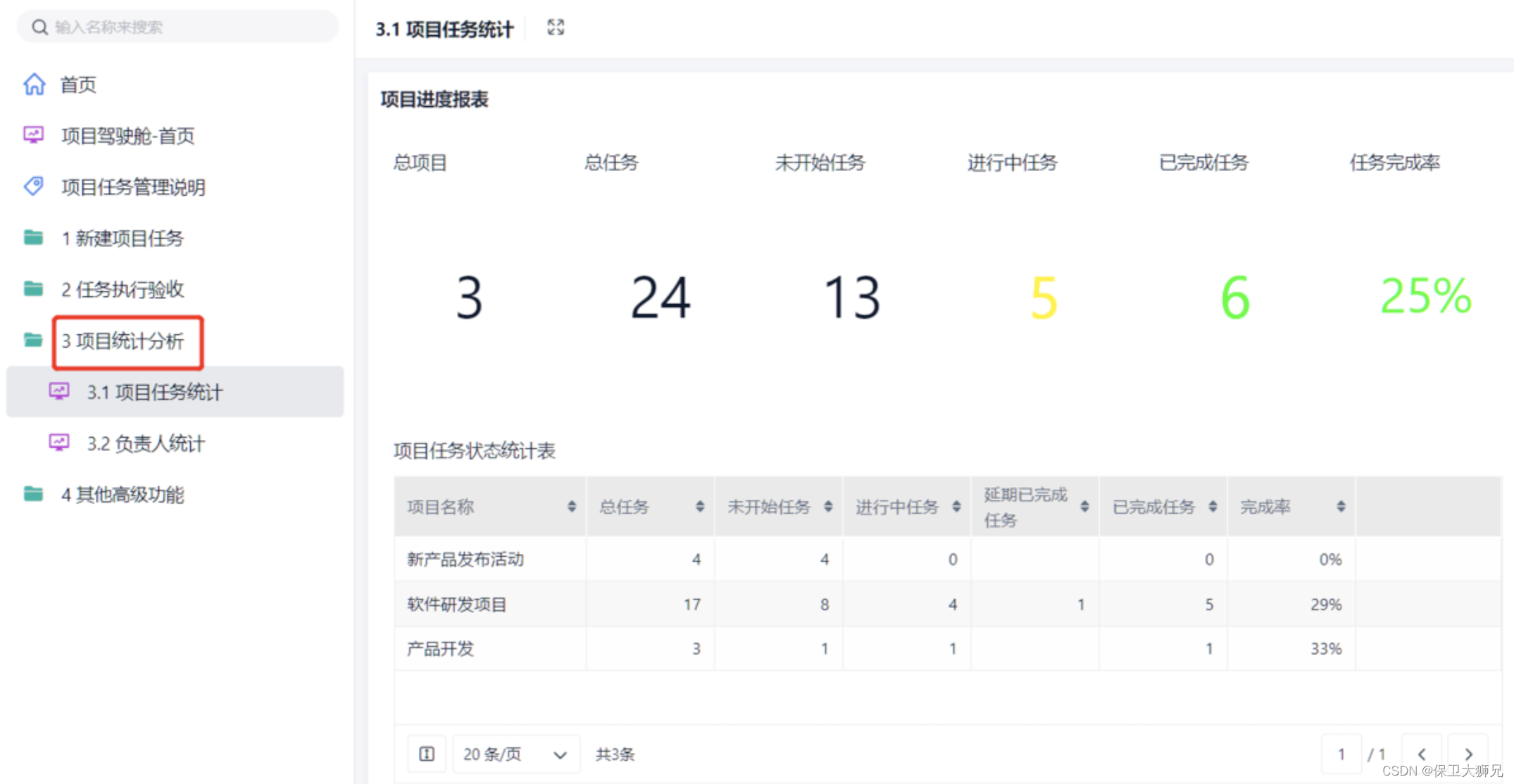你可以在【3 项目统计分析】中看到项目任务的统计,负责人的统计等等,非常简单方便。