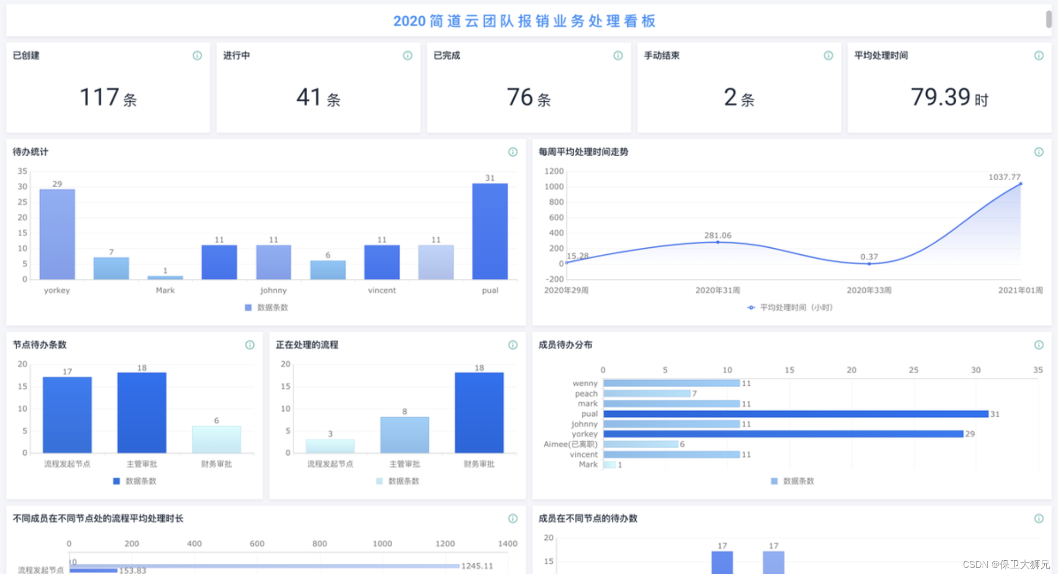 这些数据可以清晰地看出项目的流转情况,比如项目总数有多少,项目正在进行的有多少,每个节点的平均处理时长是多少;