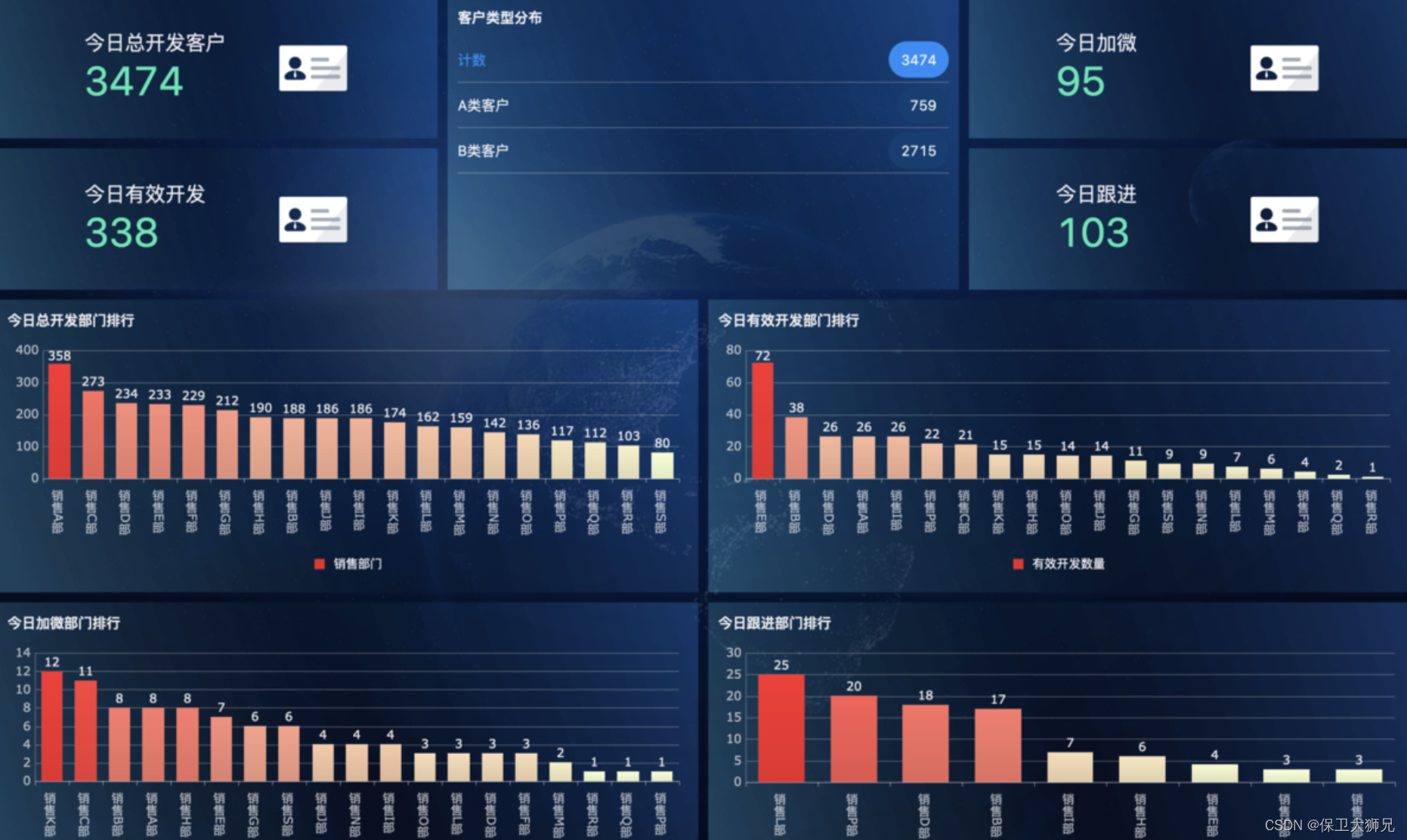 通过仪表盘对全时期、多维度的销售数据进行统计分析,管理者可以看到团队的客户开发情况,辅助进行业务指导;为了能够帮助销售员聚焦经历跟进和转化客户,通过个人/团队客户开发看板,查看个人业绩和相关业绩排行,辅助实现个人销售能力的成长。