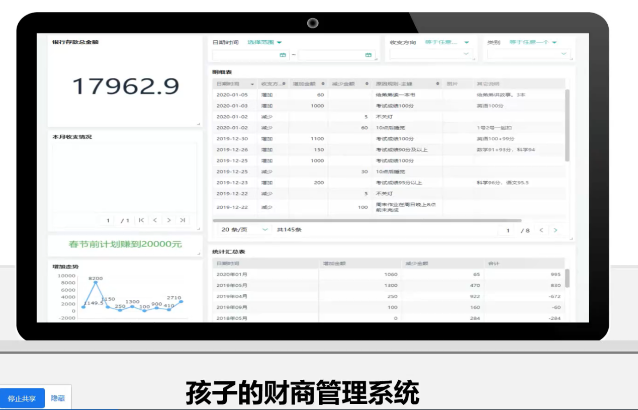 从19年初开始,受广东溢达(一家纺织集团)推荐,接触到简道云,的确是投入成本低,所以从家用压岁钱管理系统(孩子的财商管理系统),还有一个行为考核系统开始运行: