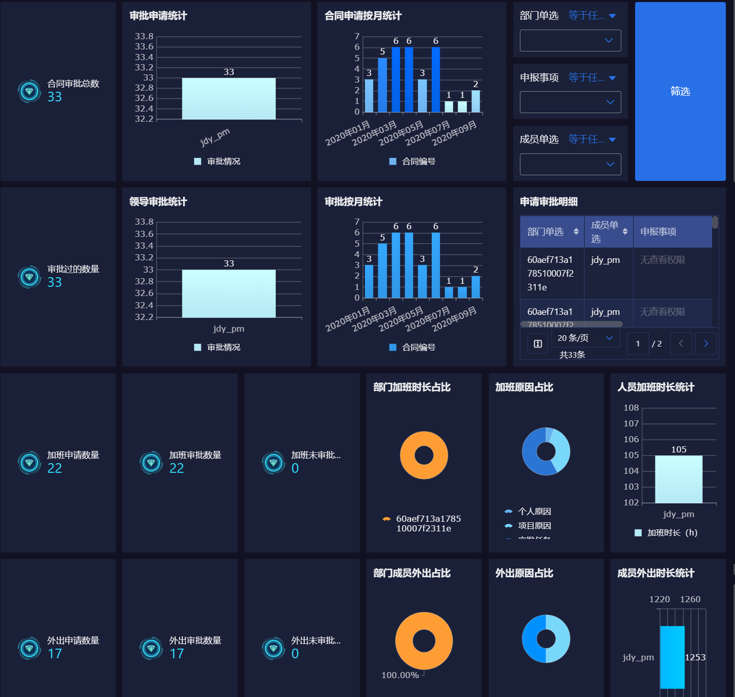 还是用上面的OA系统来说,数字化的OA不仅仅是简单的信息统计,还会基于收集到的数据进行分析,生成详实的数据分析图表,这些图表就是用来给决策者提供科学决策依据的。