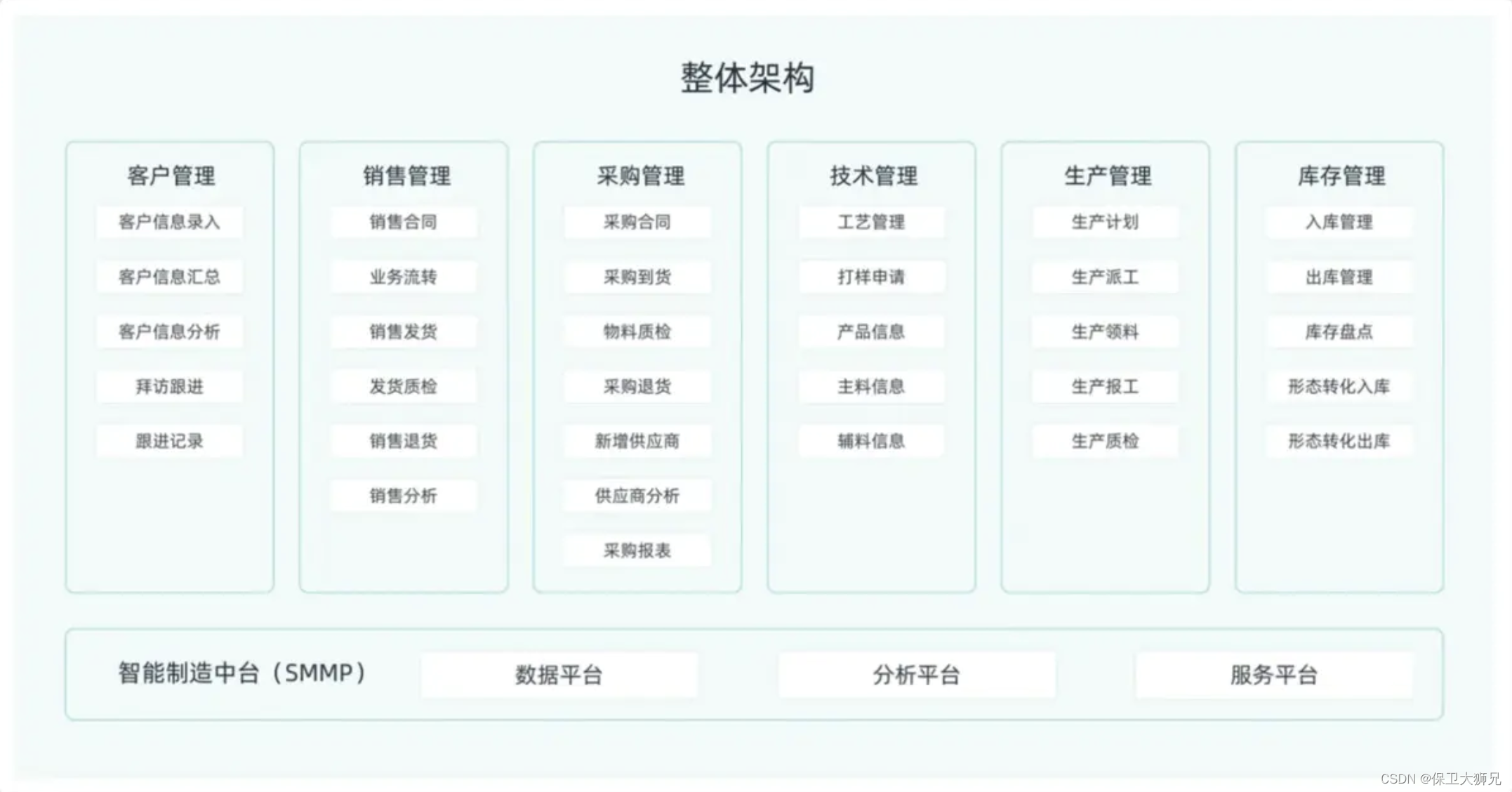 一提到制造企业数字化转型,大家第一个想到的一定是ERP系统,ERP系统相较于前面几种系统更加复杂,涵盖的范围也更广泛。一般包含这些模块:客户管理、采购管理、销售管理、库存管理、生产管理、技术管理和辅助计算的全流程。