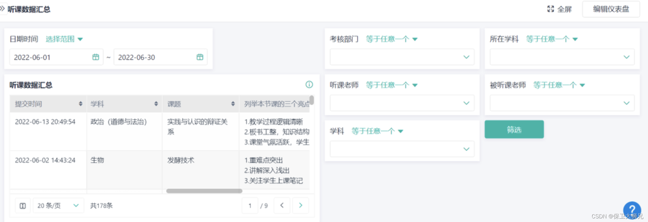 南京师范大学附属实验学校利用简道云+企业微信实现了智慧校园建设,解决了利用微信等日常社交工具进行各项工作提交等传统方式带来的信息碎片化、数据收集困难、更新不及时等弊端。如:利用简道云【流程表单】的功能,通过后台搭建表单和设计好表单信息实现了于各类听课数据的汇总。