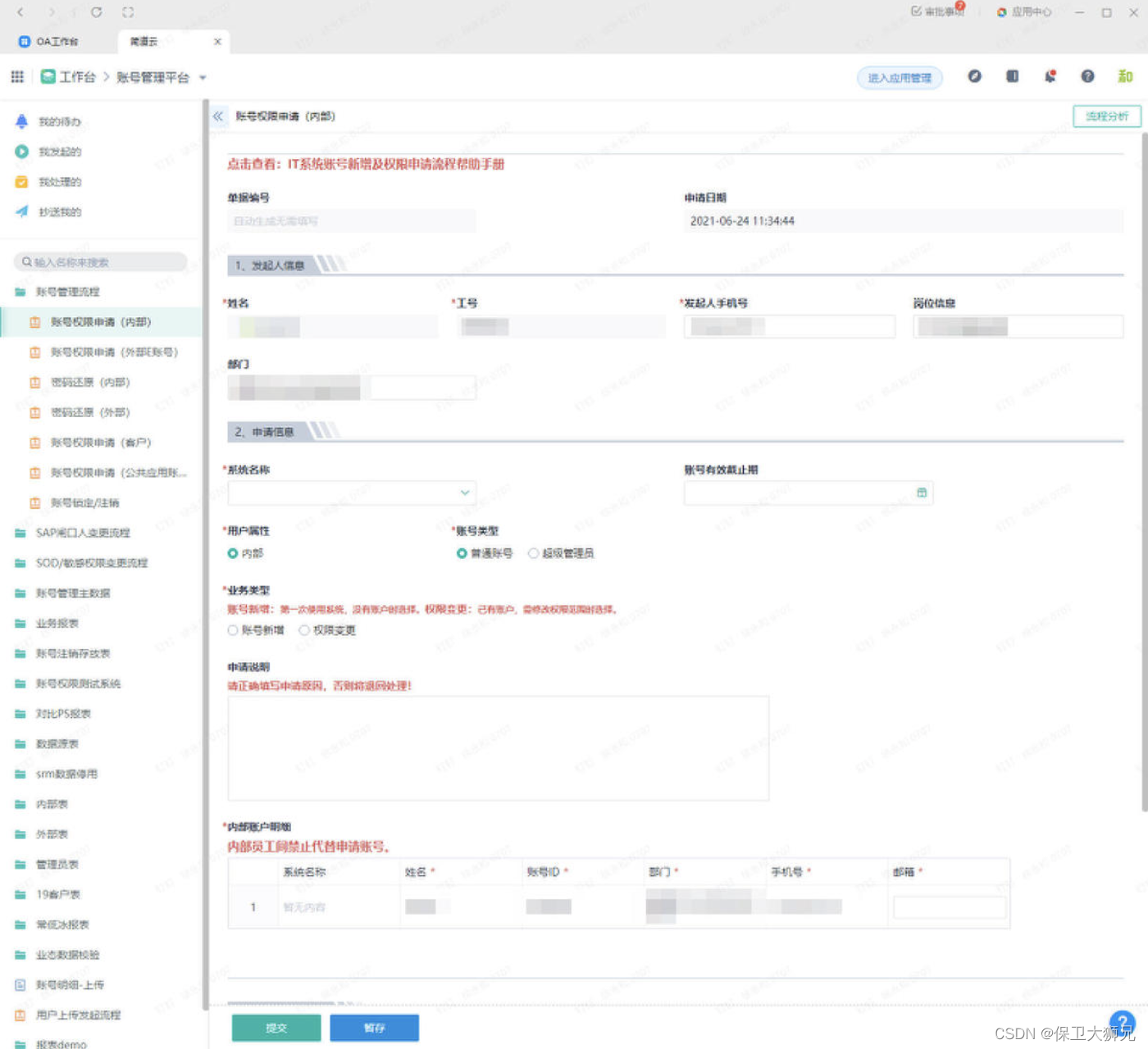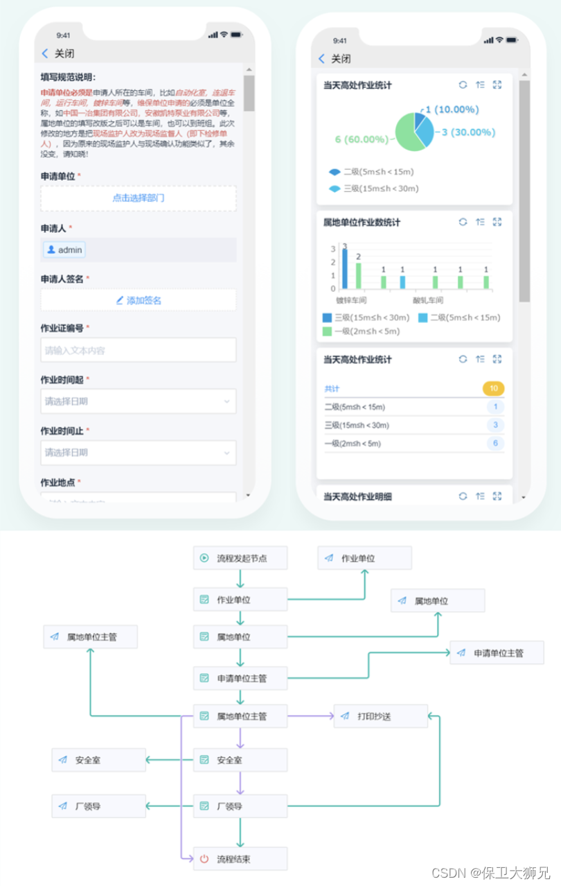✅现在:完成一个危险作业证办理只需要30分钟,工人只需要在线上申请办理,相关负责人收到消息提醒后随时随地都可以进行签名审批,既保证了效率,又做到了责任到人降低了安全风险。 表单与流程设计如下图:
