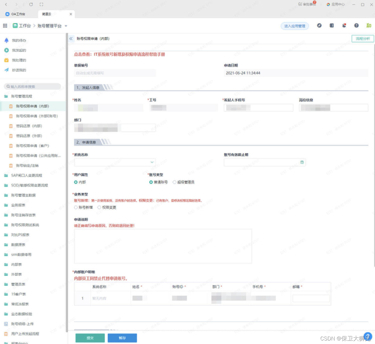 蒙牛的员工有4万多人,内部有SAP、OA、CRM等各种各样的系统。员工经常会需要修改密码、开通账号权限,这些需求量非常大。账号管理系统的流程上线之后,IT部门可以在简道云中,对各个系统账号申请及变更的需求进行统一的管理。只需要提交流程,就可以实现密码重置、账号申请、信息变更等。
