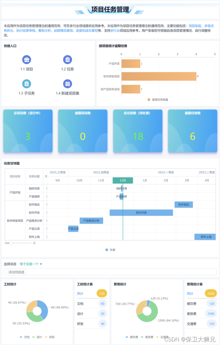 - 看板、甘特图把控任务进度:使用任务数据看板实时查看项目延期情况,甘特图直观展示任务进度,项目整体进度一目了然,及时掌握项目延期风险。