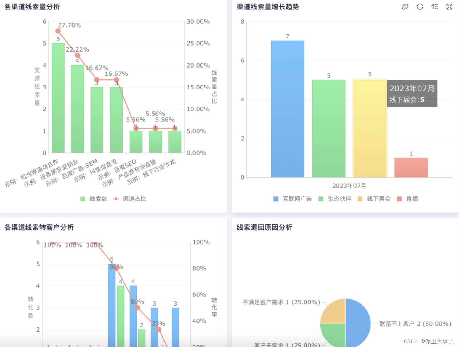 此时,最关键的一点是需要对客户进行360度全方位画像。较为方便的操作是利用crm客户管理系统模板,根据客户的属性、行为等进行多维度的分析,以便于更好地了解客户需求和行为,优化客户服务和营销策略。这些crm客户管理系统的报表可以包括客户增长率、客户满意度、客户转化率等多种指标。