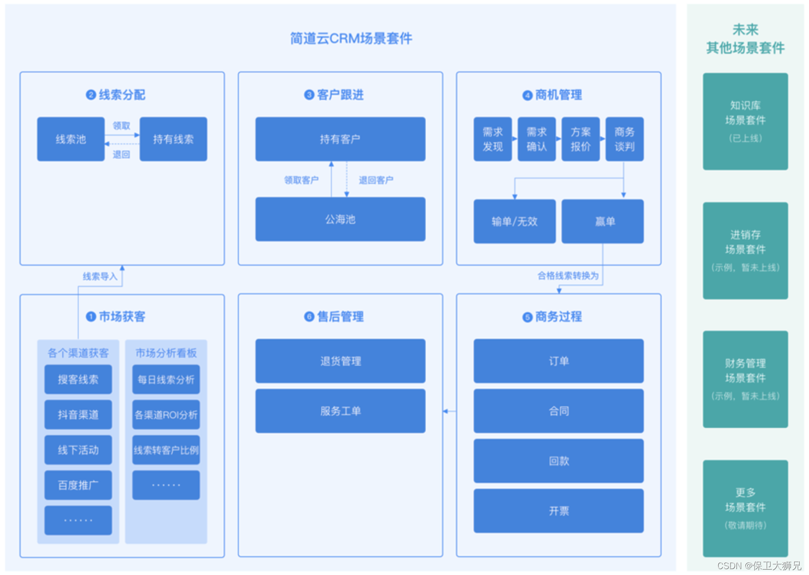 这款CRM客户管理系统功能很完善,基本能够涵盖市场获客、线索分配、客户跟进、商机管理、商务过程及售后管理等CRM客户管理系统场景中的所有业务,如下图: