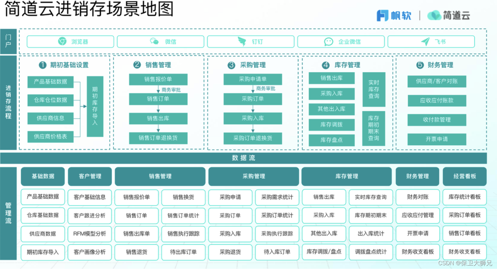 这个系统将进销存管理切分成五个模块(如下图),打通了“采购——销售——财务——库存”的整个流程,能够统计到业务中的各种数据,并且把数据以仪表盘的形式实现可视化,便于管理层决策。