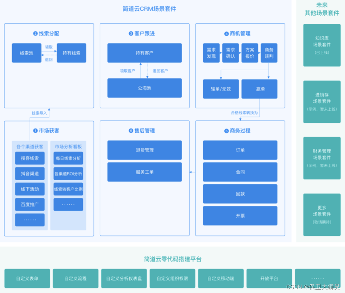 提供从市场获客→线索分配→客户跟进→商机阶段管理→商务过程→售后管理全流程方案