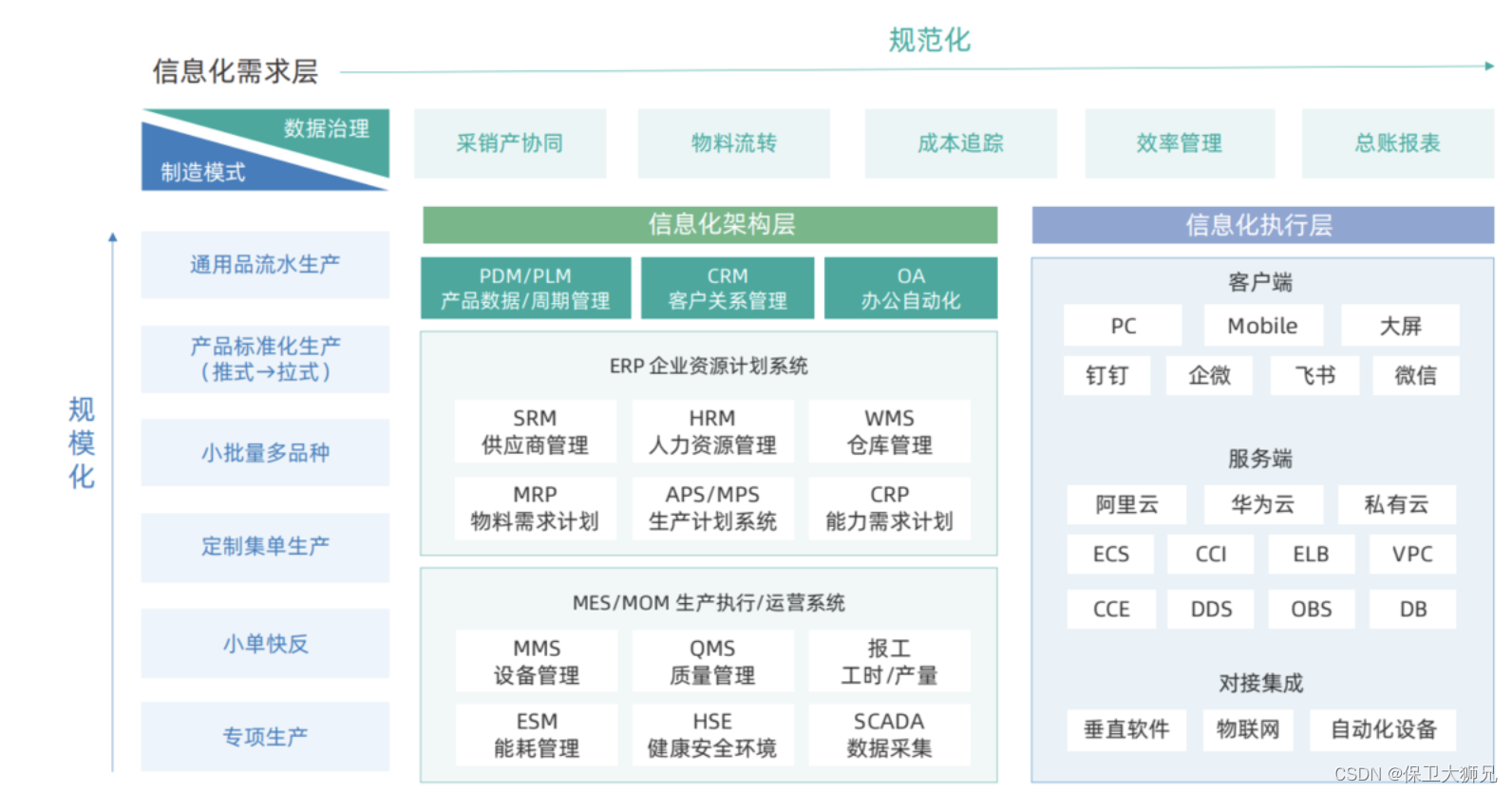 - 精细化管理部门业务系统建设:典型为质量、精益、安全等部门,其系统需求个性化程度大,需要精深的管理理论支撑,还要配合企业实际情况适应性落地。这些部门的系统建设,主要是为了促进核心业务管理精细化,用数据体现改善前后的差异,用流程固化改善成果;