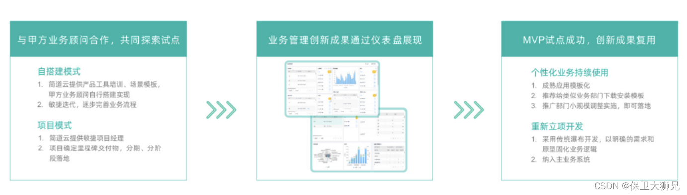 业务试点的创新成果可以通过仪表盘呈现,帮助企业实时了解业务状况和数据变化。最终 MVP 试点成功后,企业可以将创新成果复用于个性化业务和集团统建业务中: