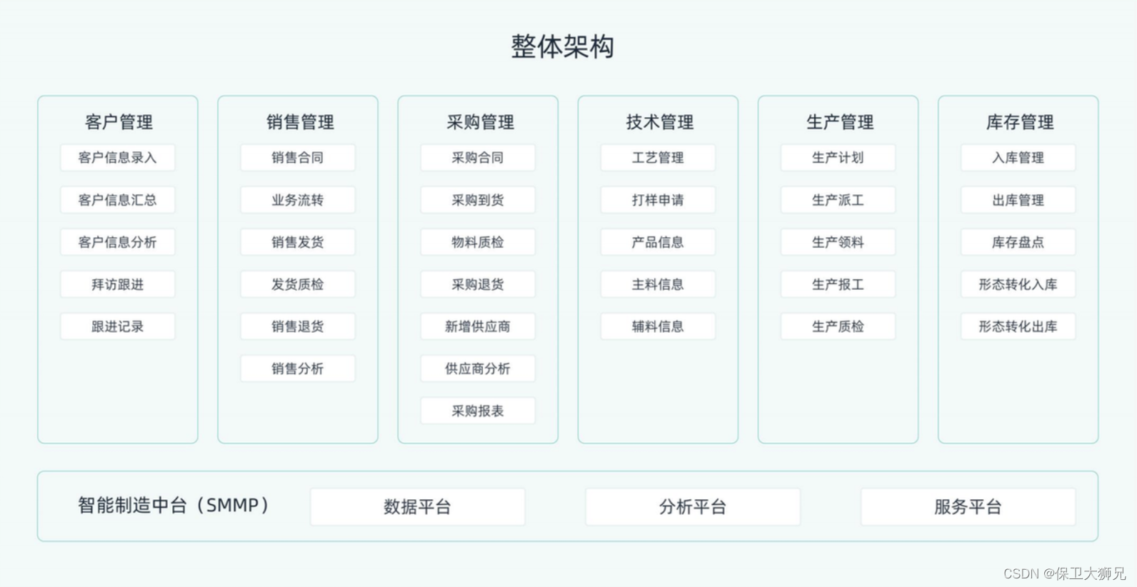 我们公司使用的ERP系统,其主要功能分为六个模块,客户可以根据自己的需要自由选择想要使用的功能,并在此基础上进行二次搭建,相较于传统ERP更加灵活高效,非常适合中小型企业使用。