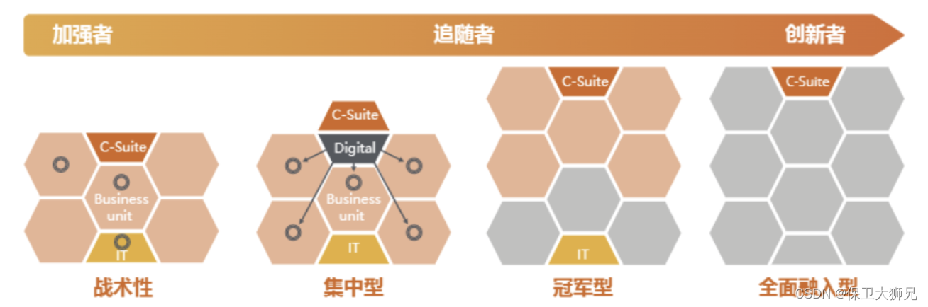 伴随数智化在组织内部的推进程度,存在四种组织形态,多数企业往往认为自身已通过数字化技术的引入、数字化小组的建立完成数字化组织的转型,然而,市场上大部分企业组织的数智化程度仍然作为数智化加强者、追随者,处于战术型和集中型两种形态之间,还需进一步向冠军型、全面融入型组织形态演进,从而蜕变为数字化的创新者。
