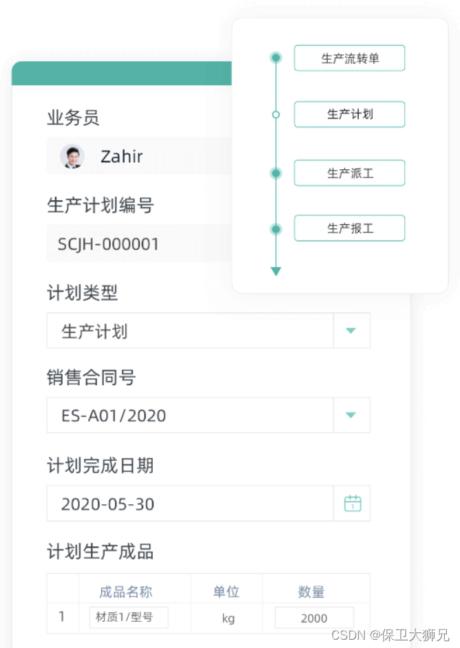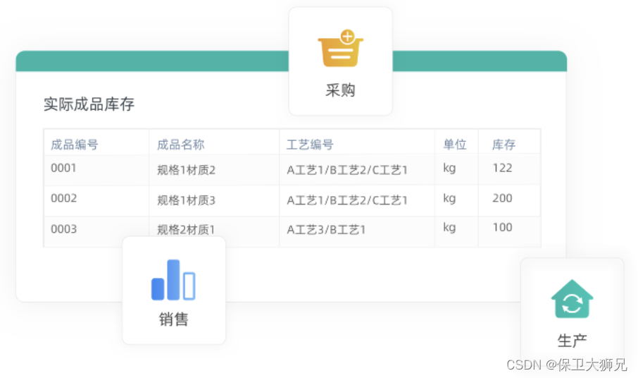 - 生产单又能够联动出该产品需要哪些生产原料,自动和库存中的原料数据做匹配,识别原料是否缺货,缺货的话给采购员建一条采购待办流程;