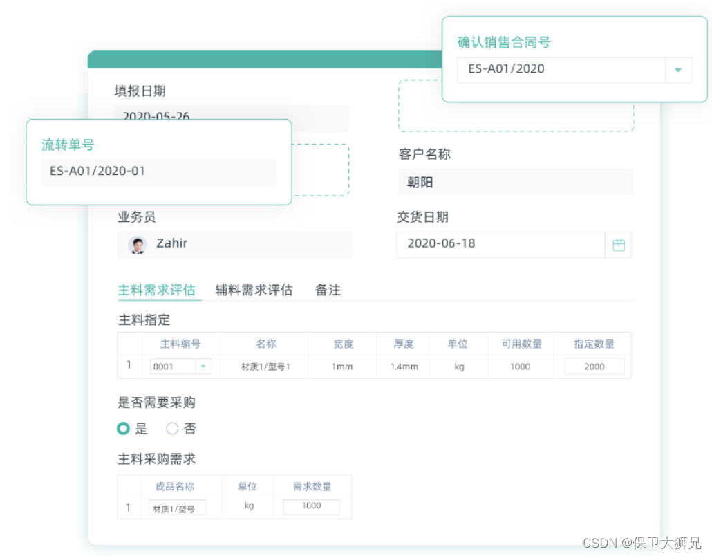 - 业务员根据销售合同,制作业务流转单,明确合同中对应产品的物料 BOM 及物料需求,并指定仓库中可用的材料进行库存锁定,同时确定需采购的材料明细;