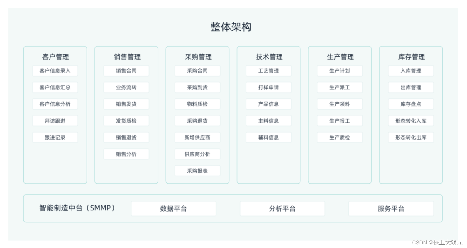 ERP系统面向制造业,涵盖客户管理、销售管理、采购管理、技术管理、生产管理、库存管理六大主要场景。