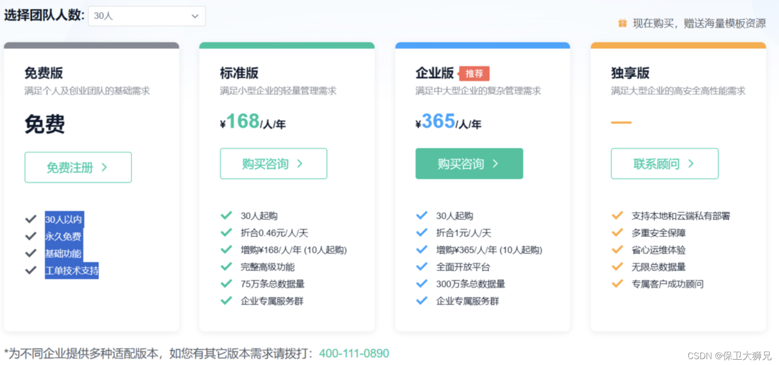 而JDY提供免费版、标准版、企业版和独享版4个版本。免费版提供30人以内的基础功能使用,标准版5040起/年提供完整高级功能,企业版提供更全面的开放平台,独享版支持私有部署,均支持功能&人数增长。