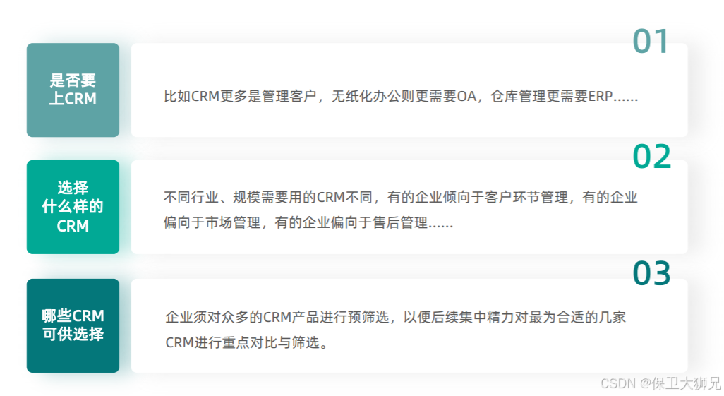 企业在选择CRM时,要进行深入的调研和对比。具体来说,可以从以下几个方面入手: