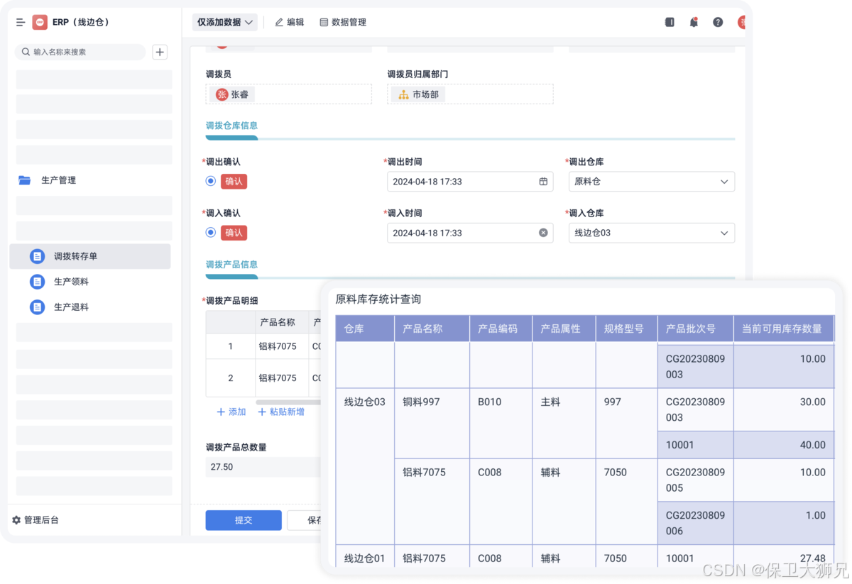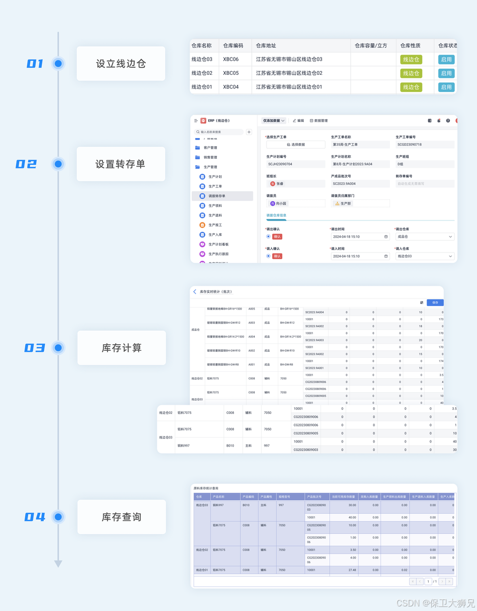 - 调拨管理模块:记录物料的出入库情况,以及从仓库到线边仓的转移过程。
