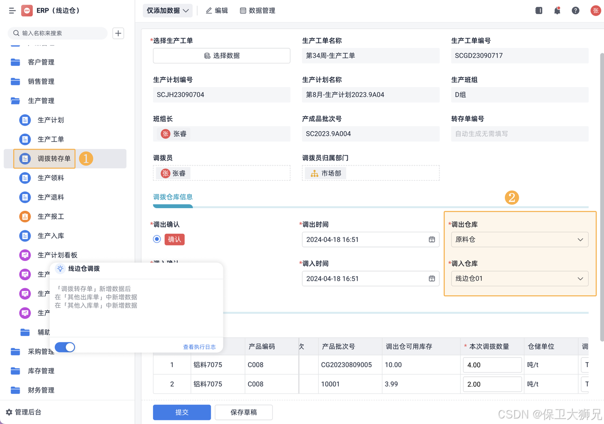 调拨转存单主要用于管理线边仓与其他原料仓的出入库记录,从原料仓调拨至线边仓的库存均通过调拨转存单进行记录和管理,调拨后的原料入库到线边仓后,由生产部分自行管理、使用。