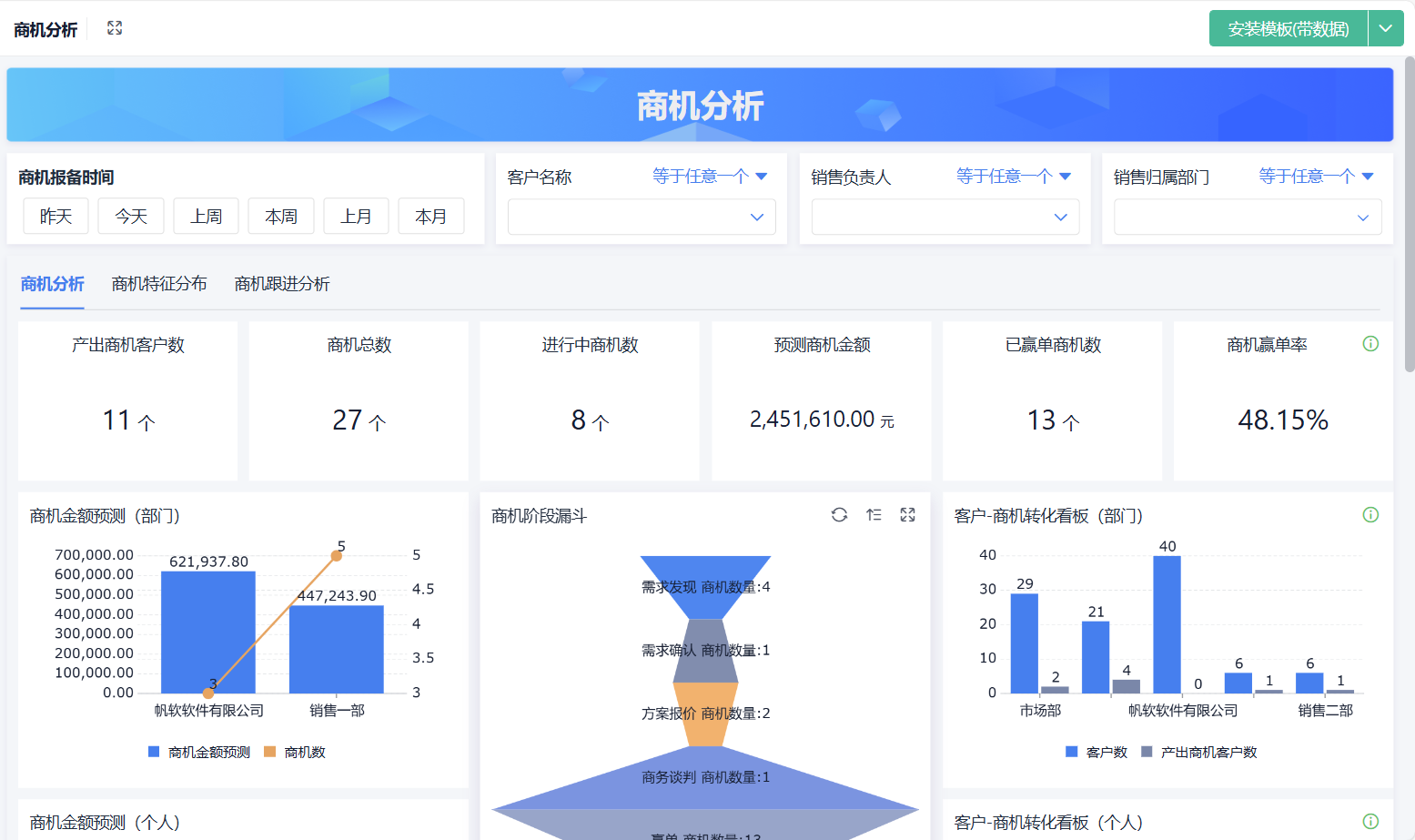 CRM系统不仅帮助你了解客户,更能帮助你预测未来的销售机会。CRM通过分析客户的历史行为、兴趣爱好、互动记录等数据,能够预测哪些客户有较高的购买意向,哪些客户可能处于流失风险,哪些客户已经是你公司最忠诚的用户。
