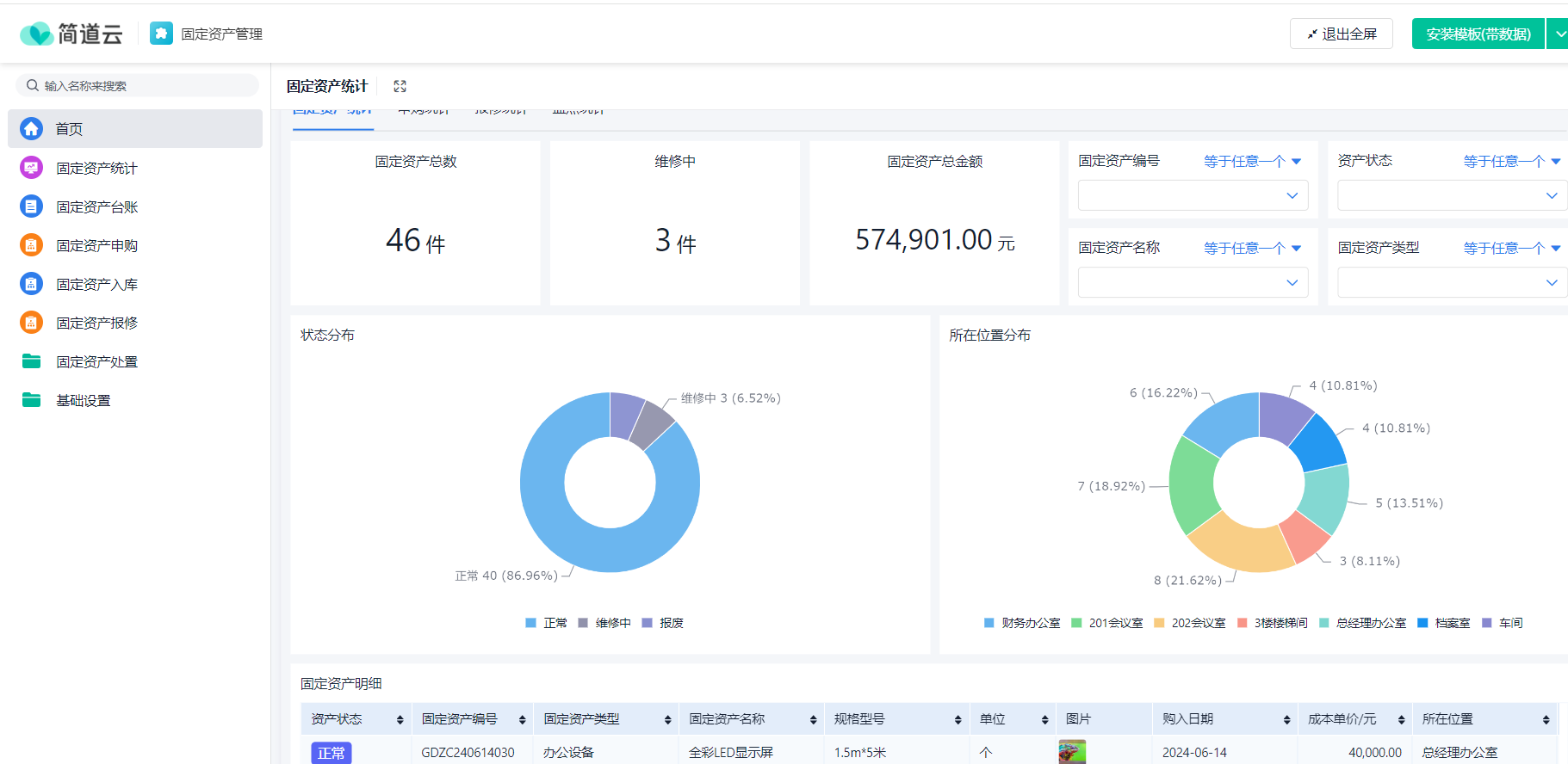 - 数据可视化:通过图表展示资产分布、使用率、维修成本等关键指标。