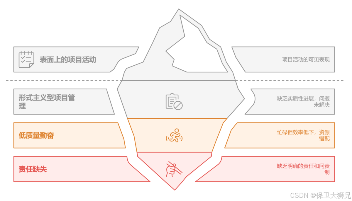 表格填了、日报交了、会议也开了,但没有任何实质性进展,问题没解决,目标没推进。这种情况最常见于“形式主义型项目管理”。