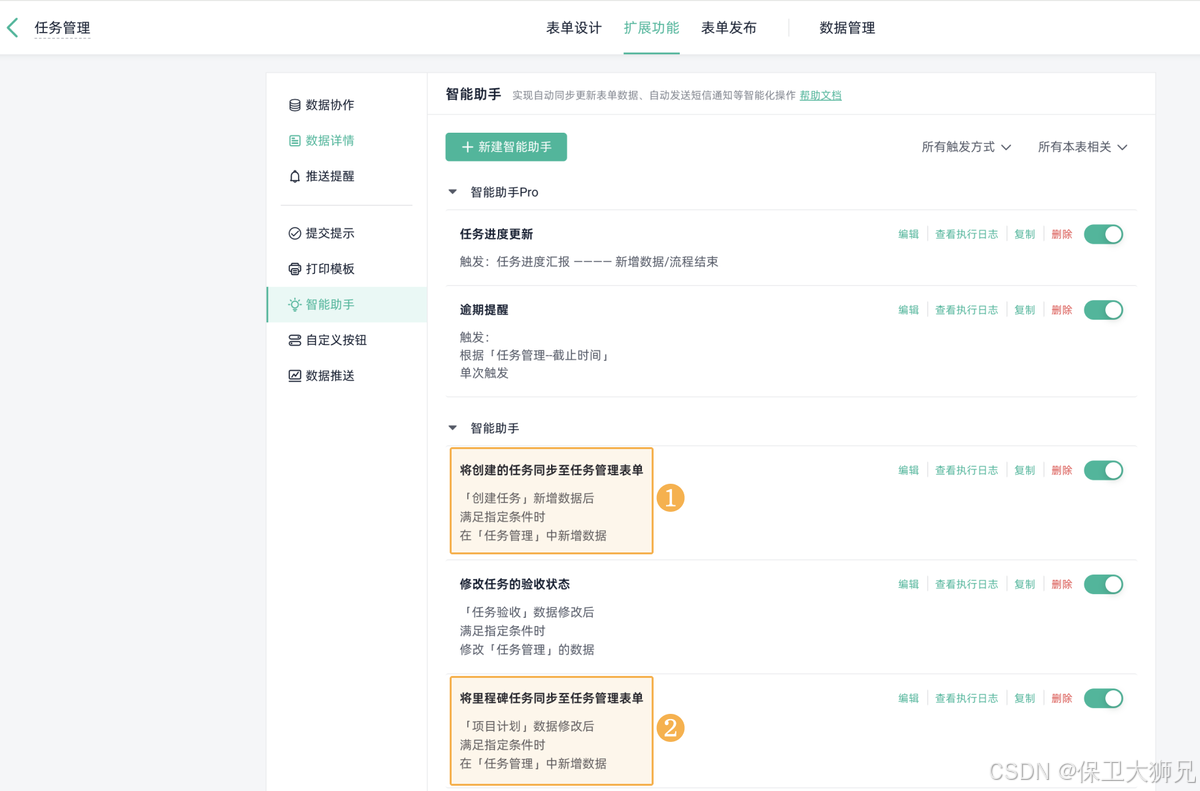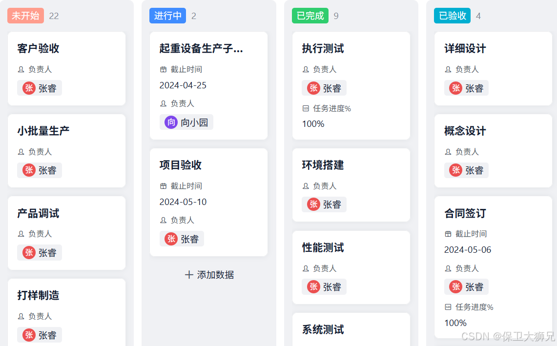 - 自动生成项目过程数据(耗时、延期、责任人等)
