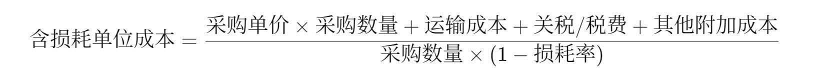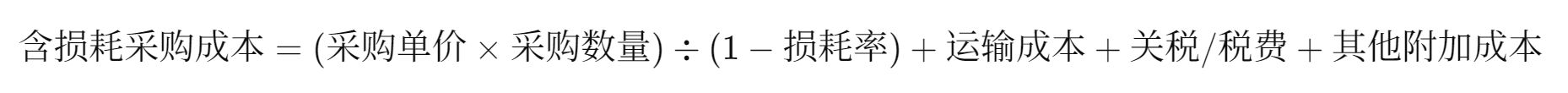 含损耗采购成本=(采购单价×采购数量)÷(1−损耗率)+运输成本+关税/税费+其他附加成本