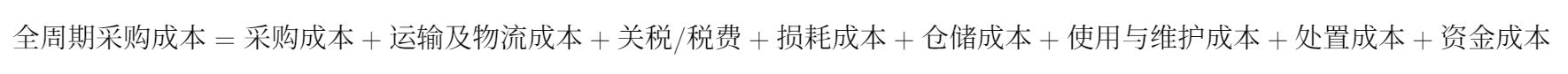 全周期采购成本=采购成本+运输及物流成本+关税/税费+损耗成本+仓储成本+使用与维护成本+处置成本+资金成本