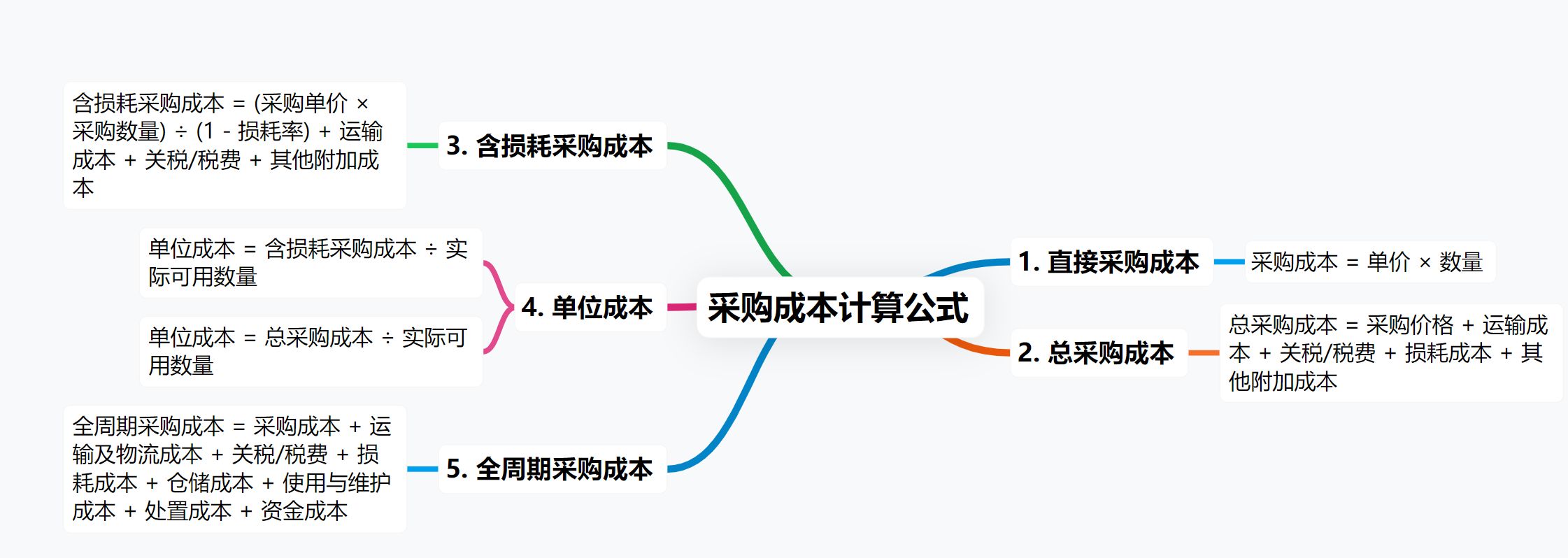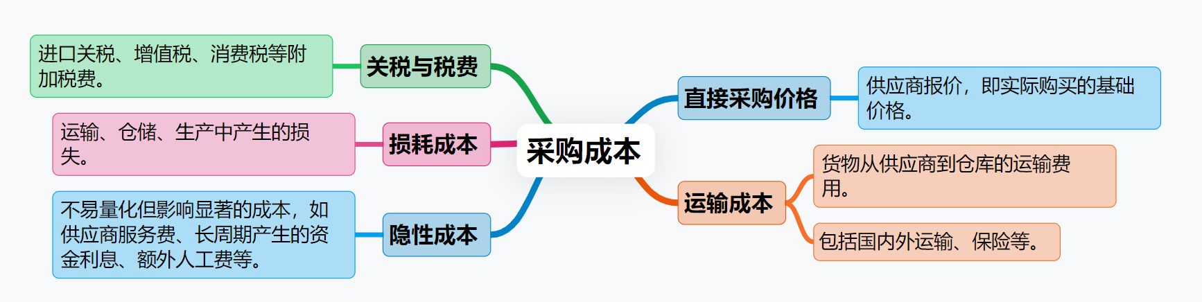 - 采购成本不是单价,而是整个采购环节的真实投入,包括价格、运输、税费、损耗和资金占用。