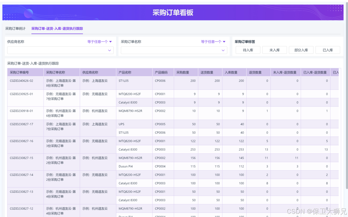 采购下单后,供应商发货、物流在途、到货验收,每个环节都应该实时更新: