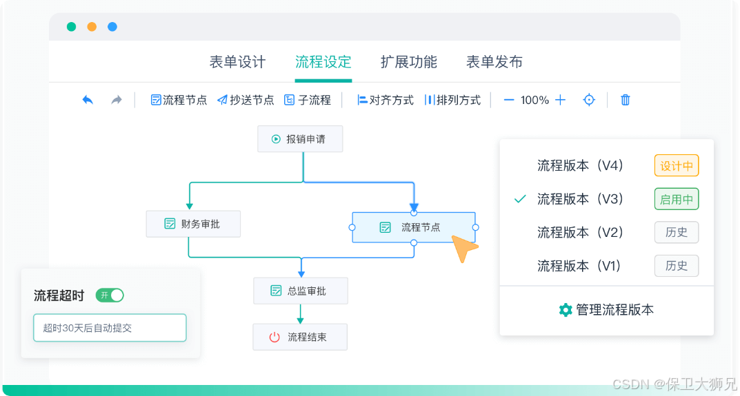 - 审批流程可以拖拽配置,随时调整;
